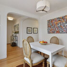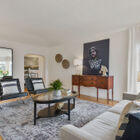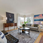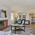 Approaching the home, you will immediately be charmed by the playfully elegant detailing gracing the home’s facade. Curving art deco-style steps, railings, and a matching awning lend a distinctly 1930’s feel, while original garage-level decorative window gratings add a subtle flair. The home’s thoughtful L-shaped layout is also visible from outside, as the enormous living room beckons to your left as you enter.