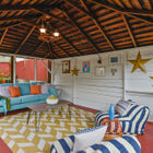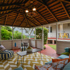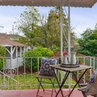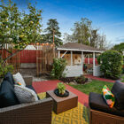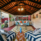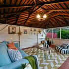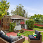 - Enclosed rear garden features a large covered open-air structure, wired for electricity and perfect for use as a workshop or your own outdoor cocktail lounge