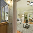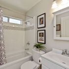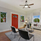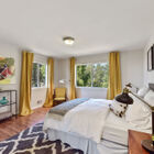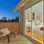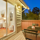 Accessible from the living room by way of a lovely staircase, the second level of 4121 Maybelle is warmed by beautiful hardwood floors. Both upper level bedrooms are bright and spacious and feature sliding door access to yet another deck that also stretches the length of the home, with still more opportunity to enjoy the stellar view. In one bedroom, an eye-catching stained glass window reminds you of times gone by — just one of the many vintage details that characterize 4121 Maybelle. The shared hallway bath on this level is upgraded with a stylish step-in shower and sleek vanity.