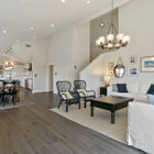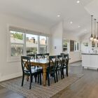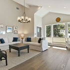 The dramatic vaulted ceilings, tall windows, and modern European engineered hardwood floors create a sense of light and serenity in the spacious living room that extends into the open dining room.