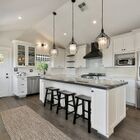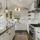 Sunlight streams through a wide bay window into the lavishly updated eat-in chef’s kitchen. A stunning Brazilian Palisandro marble island with breakfast bar takes center stage under the glow of distinctive pendant lights, and an expanse of stone countertops with subway tile backsplash provide abundant space for meal prep. Stylish Shenandoah cabinets provide plentiful storage, and a 6-burner NXR Professional gas range and chimney-style hood make cooking a joy. At one end of the kitchen, a door opens onto the spacious patio - perfect for taking trays of hors d‚Äòoeuvres out to waiting guests.