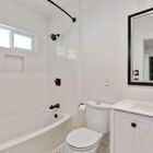 Upstairs are three bedrooms on one level, one an inviting owner’s suite featuring a large walk-in closet and a wall of windows overlooking the lush backyard. The adjoining bath boasts dual vanities and a spa-like Serenity Shower enclosure with two rain showerheads and an intriguingly patterned tile floor.