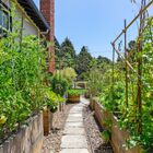 In the side yard is a feast for the eyes and for the kitchen: an urban farm of garden beds is planted with a medley of fruits and vegetables including tomatoes, melons, cucumbers, eggplant, peas, as well as an herb garden - all watered with by a rain-catching system with enough storage to last the entire growing season.