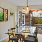 From the traditional porch, the front door opens onto the spacious common area with burnished redwood floors and a modern sensibility. Oversized picture windows bathe the living room in natural light, and a brick fireplace graces one wall. The adjoining formal dining room features distinctive pendant lights and multi-paned French doors that open onto the expansive deck and beautifully landscaped back yard.