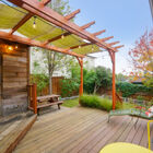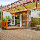 The enclosed back yard is an enchanted garden with a lush lawn, mature trees, bamboo, and grasses, as well as fenced beds for an urban garden planted with cherry tomatoes, cucumbers, kale, and chili peppers. Beneath a sheltering pergola, an expansive renovated redwood deck and brick patio are ideal for outdoor entertaining or a family barbecue. Alongside the deck is a detached structure with multi-pane windows and French doors - a quiet space for a home office, artist’s studio, or yoga room.