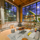 The main floor features an open living area with eat-in kitchen, bonus room/office, powder room, and laundry area. On the mezzanine level, the spacious loft owner’s suite enjoys a treehouse sensibility as natural light filters through the branches of the towering oak outside the expanse of windows. An industrial-sized garage with assigned parking and direct interior access provides urban convenience.