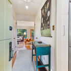 A vintage Dutch door opens onto the spacious entryway with shining hardwood floor. To one side of the entry, a door has been whimsically painted to resemble shelves of books with colorful spines, opening onto a charming powder room with decorative tile floor, distinctive corner sink with stacked stone backsplash, and a luminous skylight.