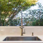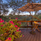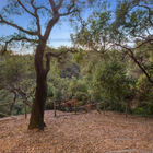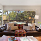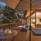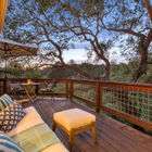 At the back of the home, the expansive living room is illuminated by huge corner windows filling the room with light and providing an exquisite view of the wooded surroundings. An arresting stone fireplace and built-in shelves grace one wall, while glass French doors lead to a huge wrap-around deck running the width of the house. The sun-dappled deck beneath magnificent live oak trees enjoys expansive wood and canyon views, an ideal spot for entertaining or just relaxing under the stars on a summer evening.
