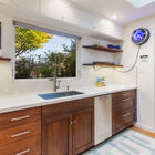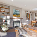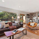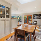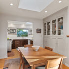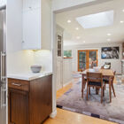 To the other side of the entry, the stylishly remodeled chef’s kitchen gleams beneath a wide skylight and features stone countertops with subway tile backsplash, burnished wood cabinets, floating shelves, and a space-saving slide-out pantry. The discerning home chef will also appreciate the Viking gas range with Faber hood, Liebherr refrigerator, and Miele dishwasher. Through a doorway, another skylight casts a warm glow on the adjacent dining room with its built-in hutch for storage of table linens and kitchen collectibles.