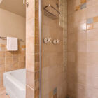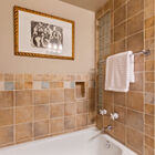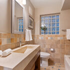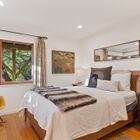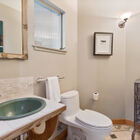 The cheerful shared bath has been completely remodeled with colorful tiled walls and a glass brick window, as well as a step-in tile shower and separate tub. A lovely custom walnut vanity with concrete sink provides abundant storage.
