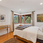 Downstairs in the spacious owner’s bedroom, oversized corner windows offer an expansive wooded view, and a large closet with custom organizer provides ample storage. The second bedroom could be configured as a den or study with its elegant stone fireplace and beautiful wood-framed windows overlooking the backyard. A separate door opens onto a lower deck in the backyard.