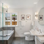 From the owner’s suite, glass doors lead out to a flagstone patio and lush landscaping reminiscent of a secret garden. Mature trees, ferns, and hydrangeas enhance the tranquil spot, perfect for a lazy morning cup of coffee.