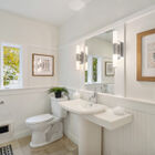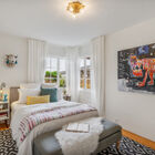Two additional bedrooms share an updated large bath with tile floor, wainscoting, pedestal sink, built-in shelves, and tiled walk-in shower. One bedroom has sunny corner windows; the other enjoys French doors leading to the flagstone patio in the backyard.
