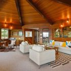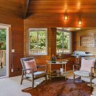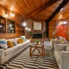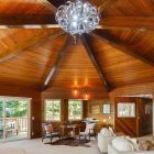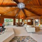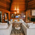 - Huge wide-open wood-paneled common area functions as an entryway, living room, dining area, and lounge