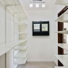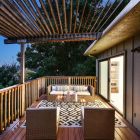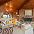 - Angled wood paneling and wood floors add interest and texture throughout the house