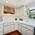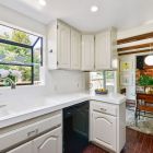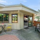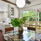 - Cooks’ kitchen with whimsical glass-doored cabinets, greenhouse window, copper stove hood, dual-compartment porcelain enamel sink, skylight, and breakfast nook with sliding doors to the rear deck