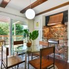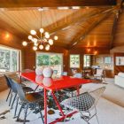 - Common area also has many special touches, including a pass-through to the kitchen, built-in display shelving, mid-century-style chandelier, massive fireplace, sliding glass doors to the private rear deck, stone flooring in the entryway, and raised dining area