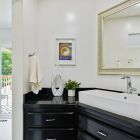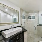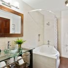 - Shared hall bath has a jetted tub and owner’s bath has sleek modern tiling and glass-walled shower