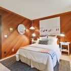 Winning design elements infuse every inch of this stylish home, which doles out lovely surprises in each room. The kitchen has whimsical glass-doored cabinets, a greenhouse window, copper stove hood, dual-compartment porcelain enamel sink, skylight, and breakfast nook with sliding doors to the deck. The shared hall bath has a jetted tub, while the owner’s bath features sleek modern tiling and a glass-walled shower. The owner’s suite is anchored by a wide brick wood-burning fireplace and spacious walk-in closet and opens onto the deck. Angled wood paneling and wood floors add interest and texture throughout the house.