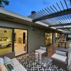 This bewitching 1,687 square foot home in Oakland’s burgeoning Leona Heights neighborhood charms and intrigues you even before you enter, as its eye-catching curved facade ushers you onward. Once inside, you will find yourself in an huge wide-open common area that is at once entryway, living room, dining area, and lounge. The soul of the house, wood-paneled yet filled with natural light, this large room’s spectacular ceiling is composed of triangular facets converging in a central pinnacle. Playful details harken to the mid-century era, including a pass-through to the kitchen, built-in display shelving, mid-century modern chandelier, massive fireplace, sliding glass doors to the private rear deck, stone flooring in the entryway, and a raised dining area that would also be the perfect stage for small musical or children’s performances, sparking your imagination and making this versatile space at once warm, fun, and engaging.