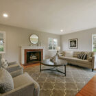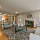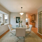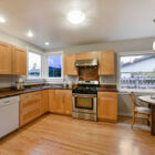 As you approach the home from either its flagstone path or the ramping, gardens planted with fruit trees, wisteria, rhododendrons, and jasmine greet you; upon entering this 1,948 square foot home from its wraparound deck, you immediately take in the open layout of the common area. A spacious, light-filled living area features a wood-burning fireplace and floor-to-ceiling picture windows, while the dining area includes a large bay window with tile detail. In the spacious eat-in chef’s kitchen, ample granite countertops and cabinetry plus a gas range with hood make for an inviting space. Throughout the open area of the home, gleaming hardwood floors provide continuity.