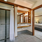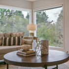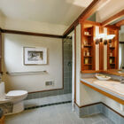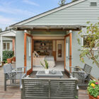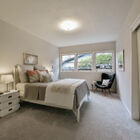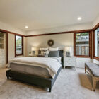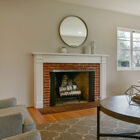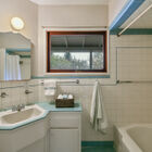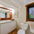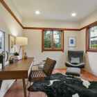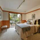 Explore the hallway and you will find three bedrooms, including one fitted with shelves, wood paneling, and French doors leading to the deck, making for a welcoming home office space. An additional bedroom shares a hallway bath that with a shower over tub and vintage tile, while in the owner’s suite, the spacious bedroom features large windows overlooking the garden and is paired with a bath with level-in shower and built-in vanity.