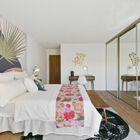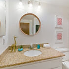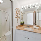 Tall windows fill the owner’s suite with natural light, and a closet with mirrored sliding doors takes up an entire wall, offering abundant space for storage. The updated adjoining split bath features a stone-topped vanity and a tile walk-in shower with glass door.