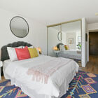 A second bedroom also features tall windows and a large closet with sliding mirrored doors. Across the hall, a generous full bath boasts a shower over tub, stone vanity, and ceiling-mounted heat lamp - perfect for chilly mornings.