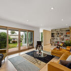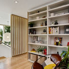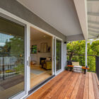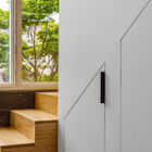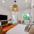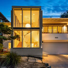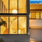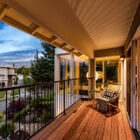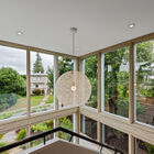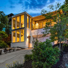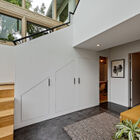 At the front of the home, the polished plank-style white oak front door opens onto a spacious foyer in the well of a stunning two-story tower of dramatic floor-to-ceiling windows beneath a modern Moooi chandelier. The dual-paned custom awning and casement windows are framed by locally-sourced hardwood, and are completely operational to catch the summer breezes as well as the warm sunlight.