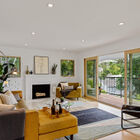 The lovely white oak staircase leads past dramatic windows to the main level and heart of the home. On the north side is the spacious living room featuring oak floors, recessed lighting, and a brick fireplace flanked by windows. An expansive wall of glass offers breathtaking views of the hills below. Double sliding doors lead to a shaded ipe wood deck, ideal for hosting a cocktail party for friends, or just taking in the magnificent view of the sun setting over the trees.