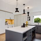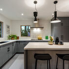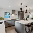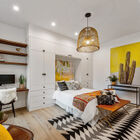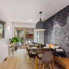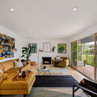 Floor-to-ceiling bookshelves separate the living room from the completely remodeled eat-in chef’s kitchen. Anchored by an expansive stone-topped island/breakfast bar illuminated by iconic Hay Danish pendant lights, the kitchen features eco-friendly Marmoleum floors, stone countertops, and designer tile backsplash flooded with light through an oversized window above the large granite sink. The discerning home chef will appreciate the Fischer Paykel wall oven, 5-burner professional gas cooktop and hood, as well as the custom pantry providing ample space for the most well-stocked kitchen. The integrated paneled Fischer Paykel refrigerator, Bosch dishwasher, and custom cabinetry create a sleek modern aesthetic.