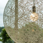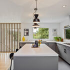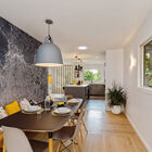 The kitchen extends into the open dining room featuring two sun tunnel skylights, custom-designed bespoke wallpaper, Normann Copenhagen Danish pendant light, Sonneman dining sconces, and custom white oak floating bench seating. French doors open onto a beautiful back patio that runs the length of the house.