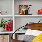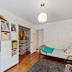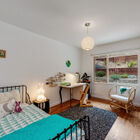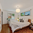 Down the hallway, the expansive, light-filled owner’s bedroom features gleaming oak floors, a distinctive Nelson Ball Bubble pendant light fixture, and custom Elfa closets. An oversized custom oak-framed picture/casement window overlooks the beautiful backyard, and a double awning window on the adjoining wall catches the summer breeze. The second bedroom also features a large window overlooking the backyard and Elfa closet with ample storage.