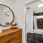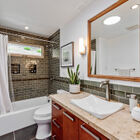 The spacious shared bath is lit by a wide awning window and sun tunnel skylight and features a beautifully tiled shower over tub and a generous stone-topped vanity with vessel sink.