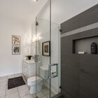 On this level is a spacious bedroom that could be configured as a ground-floor owner’s suite, guest suite, office, or media room. Custom cabinetry surrounds a space-saving Murphy bed, and an oversized casement/picture window combination with custom blinds overlooks the quiet front garden. On one wall an ingenious media system within a custom walnut credenza integrates television and other media components, and a matching built-in walnut desk with floating shelves and inset LED lighting create a cozy study nook. The adjacent full bath features a large format tile floor, a glass-enclosed tile walk-in shower, and stone-topped vanity with ample storage space.