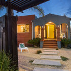 A few steps down from the main level, the private owner’s suite is a spacious, light-filled room with a walk-in closet and access to the enclosed yard. Across the landing, a barn door opens onto a huge spa-like bath with an oversized soaking tub, stone-topped vanity, and step-in shower.