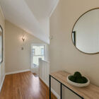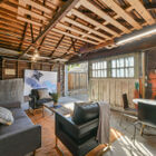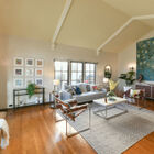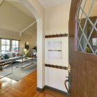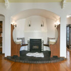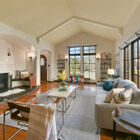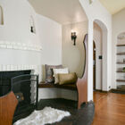 The Storybook-style arched doorway opens onto an entryway with gleaming oak floors. To one side of the entry is the sun-washed living room beneath a cathedral ceiling with decorative beams. The rounded brick inglenook fireplace features cozy bench seating, and vintage sconces and niched built-in shelves give the room a fairytale feel.