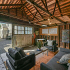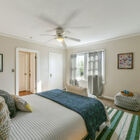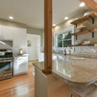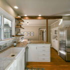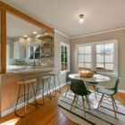 Another set of multipane French doors open onto a dining nook adjacent to the remodeled kitchen with stone countertops and subway tile backsplash, a convenient breakfast bar, five-burner gas range, and farm sink. A huge pantry offers room for nearly everything a home chef could need.