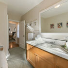 Up a half flight of stairs is a sunny bedroom with corner windows and a walk-in closet with built-in organizer for abundant storage. A spacious bath features a mosaic tile floor, tub, separate step-in shower, and a large tile-topped vanity.