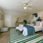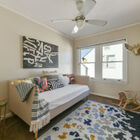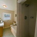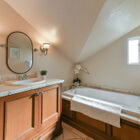 On the second level, two additional bedrooms share an updated bath with a period vaulted ceiling, tub with wood and tile surround, and a modern stone-topped vanity beneath distinctive period sconces.