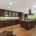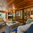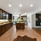 The open, eat-in kitchen is a home chef’s delight, featuring an island with built-in gas cooktop, stone countertops, double oven, and dual sink. Built-in cabinets with stained glass doors add distinction and beauty, and a comfortable breakfast nook provides not only a place to eat, but space for those who want to chat while you cook. From there, an open, wood-paneled family room makes an excellent spot to watch television or play games. For a different mood, glass doors lead from the breakfast nook to a tranquil, shady enclosed patio with stone walls and flagstones, an ideal spot for al fresco dining or quiet reflection.