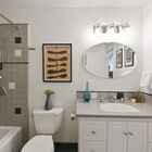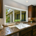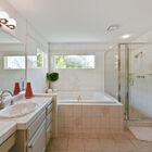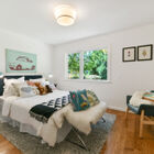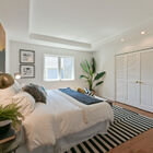 In the updated owner’s suite, the recessed ceiling and large sunny window create an airy feel. Two closets - one a walk-in - provide abundant storage. The adjoining bath features an oversized jetted tub with tile walls and windows above, as well as a step-in glass shower, and stone-topped vanity with dual sinks.