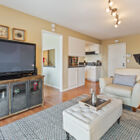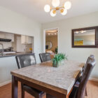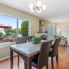 From the entryway, the open floor plan creates a great room with the spacious living room flowing into the generous dining room. A brick fireplace is flanked by oversized picture windows looking out onto a private patio and the amazing view of the bay beyond for a peaceful indoor/outdoor aesthetic.