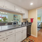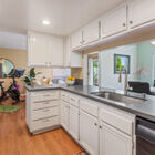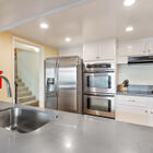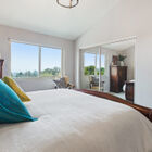 The modern kitchen layout creates an efficient work triangle with stone countertops and backsplash, glass cooktop, and built-in dual ovens. A wide pass-through cutout between the kitchen and dining room allows for ease of serving and conversation as well as an opportunity to gaze out on the bay during meal prep and cleanup. Just off the kitchen, a convenient door makes for ease of transporting groceries from the garage. Adjacent to the kitchen, the sun-washed family room enjoys wide sliding glass doors out to the back garden overlooking the bay and a casual dining area. Also on this level is a conveniently placed powder room.