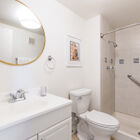 Upstairs, a vaulted ceiling gives the spacious owner’s suite a sense of openness, and oversized picture windows provide an amazing view over the treetops to the bay beyond. Large dual closets with mirrored doors provide abundant storage, and the adjacent bath features a tile floor, walk-in shower, and vanity. The two remaining bedrooms - one with a bay view and one with a walk-in closet - share a generous bath with a tile shower over tub and vanity for storage.