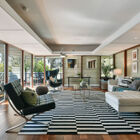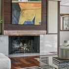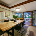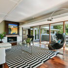 - Quintessentially mid-century modern living room is framed by vertical and horizontal lines, alcoved ceiling, magnificent wood-burning fireplace, hardwood floors, and wraparound glass walls gazing out towards the wooded hills