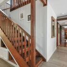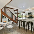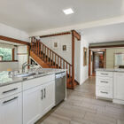 - Updated cook’s kitchen offers pull-out pantry storage under the stairs, skylights, natural stone countertops, gas range, Bosch dishwasher, and adjoining breakfast area