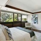 The horizontal lines of this home’s striking mid-century modern architecture lend great curb appeal, while wide brick steps, lush plantings, an olive tree, and a vibrant camellia usher you to the beautifully carved wooden front door. You are greeted by a charming tiled entry with full-length mirror, with the living room stretching before you and the kitchen to your left. The quintessentially mid-century living room feels at once graceful and grounded, perfect for hosting gatherings around its elegant wood-burning fireplace. Vertical and horizontal lines and an alcove ceiling guide the eye, while wraparound glass walls orient you towards the wooded hills. The room's new dual-pane glass walls, along with a new furnace and Nest thermostat, help keep the interior temperature consistent throughout the year. The entry’s modern taupe-grey tiled floors extend into the open kitchen and dining room, subtly creating a seamless flow, while wide windows and old growth redwood walls, beams, and window frames further unite the living spaces. This home has three inviting ground-floor bedrooms, fitted with custom shades; one ground-floor bedroom features an en-suite bath and peek-through views of the bay. The sliding barn door of the main bathroom keeps the space clear, and all three full baths feature new cabinets, sleek modern fixtures, and contemporary tiling. An irresistible owner’s suite and office takes up the entire upper level. Private and tucked out of site, the serenity of this space is amplified by dramatic vaulted ceilings and high windows, a private terrace with bay views, a walk-in closet and changing area, and a gorgeous modern bath.