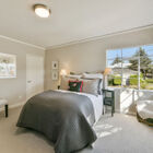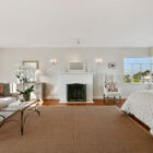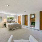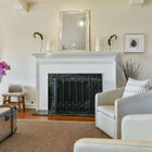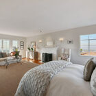 Upstairs, a welcoming owner’s suite has adjacent dressing room and closet with built-in shelves, full bath with chiseled stone tile, and step-in shower. An additional closet provides more storage space. Corner windows offer partial view of San Pablo Bay, while rear windows overlook the Bay Bridge and SF skyline. A brick fireplace graces one wall.