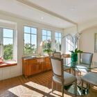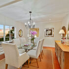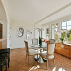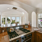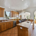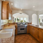 Back in the living room at 6520 Lagunitas, an ingenious circular floor plan encourages you to wend your way through the formal dining room to the remodeled kitchen. Modern updates blend style and utility, with Viking gas range and griddle, additional wall oven, natural stone countertops, abundant wood cabinets and built-in pantry shelves, breakfast bar, and spacious breakfast room with an enchanting bay view. Spanish tile floors echo the Mediterranean architectural style.